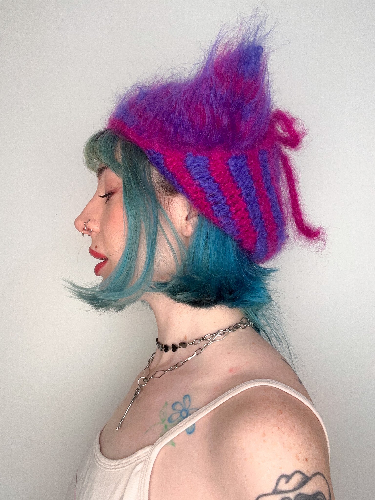 Features a pink & purple striped design with fluffy strings to secure. Made with second hand mohair & mix yarns ⭐️